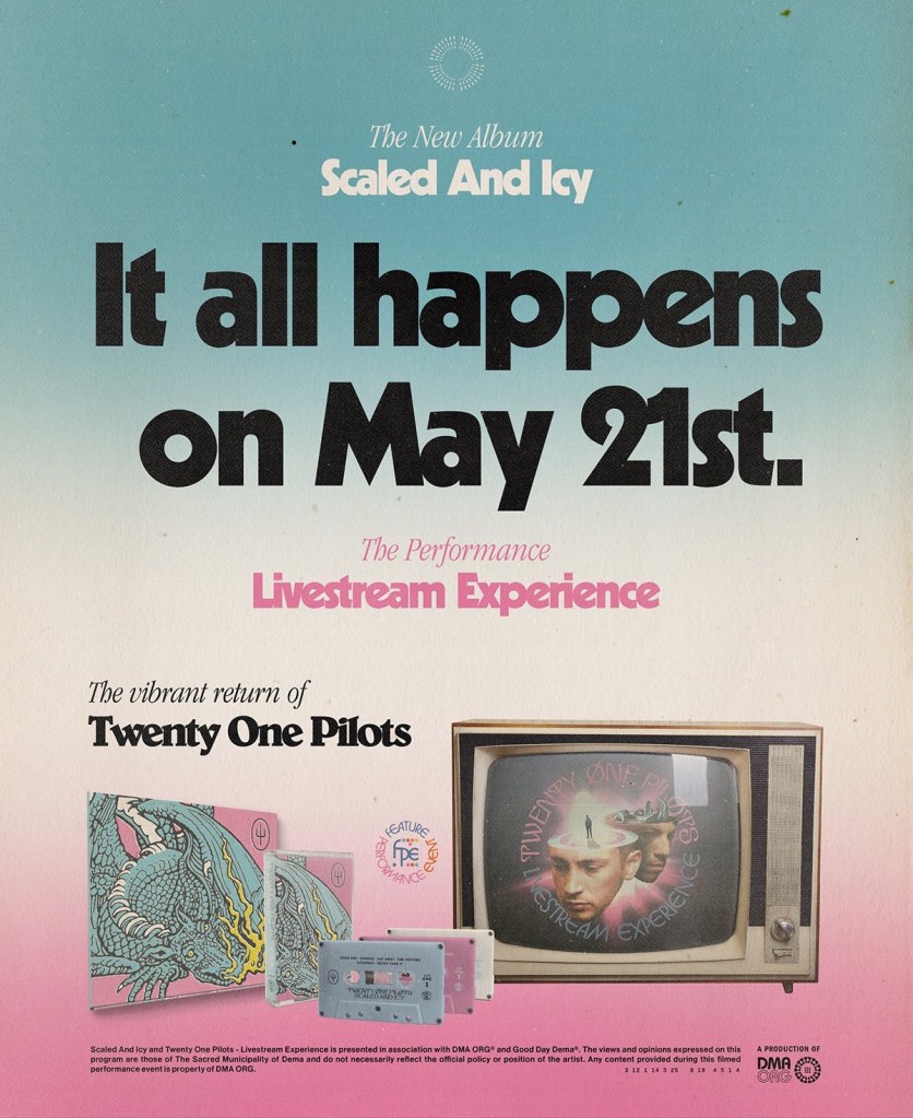 Twenty One Pilots’ new single ‘Shy Away’ is out now and their upcoming album ‘Scaled and Icy’ will be out on the 21st of May via Fueled by Ramen.