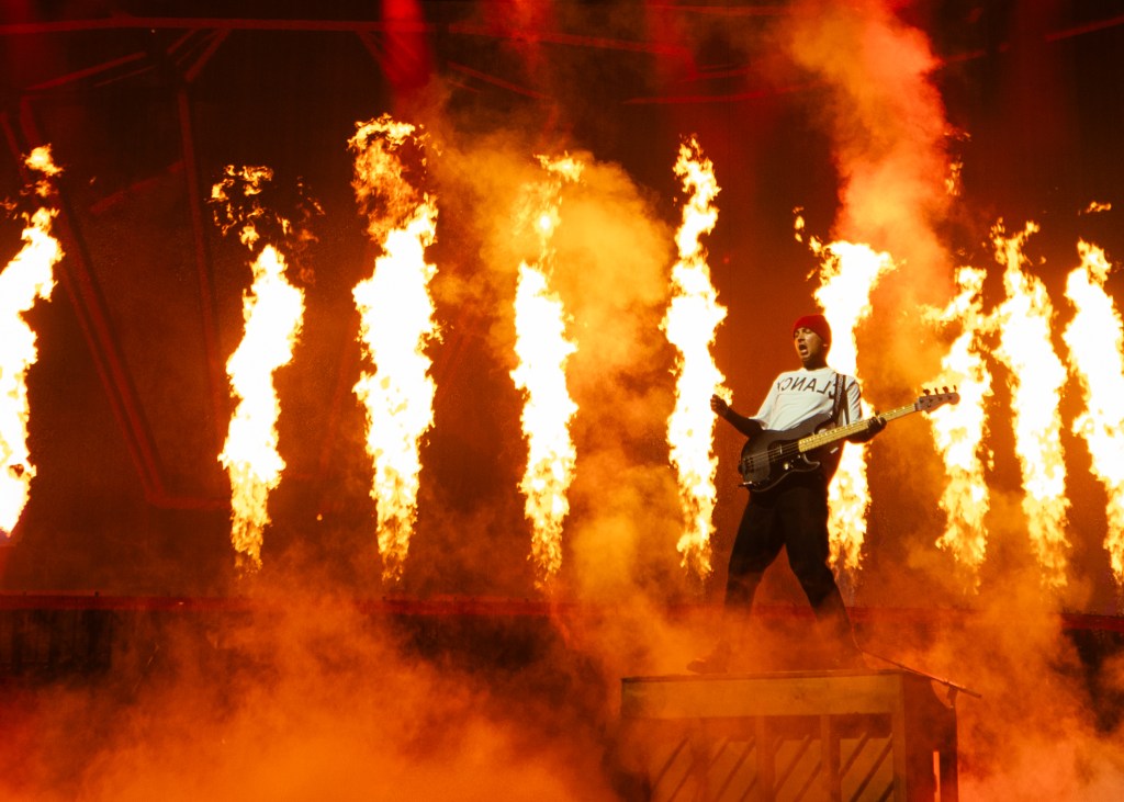 Once Joseph returns to the stage, immediately bursting into the rocky ‘Navigating’, followed by a breath-taking run of the cinematic ‘Heathens’ and a mind-boggling performance of ‘Heavydirtysoul’, which comes with flashy lights, pyro and the vocalist lying on the floor, screaming the lyrics at the top of his lungs, the rest of the concert is veiled in a layer of uncertainty and anticipation for what else might happen. While bandmate Dun continues making his mark as one of the best drummers in the industry, singer Joseph moves around the stage, bass in hand, fully aware that everyone’s eyes are fixated on him and that the fans will register any “suspicious” gestures or movements he decides to make. And so he sprinkles in a few, some so quickly and nonchalantly that only the most die-hard fans can spot them – or later analyse them on Twitter. There is the recently gone viral demo version of the vibey ‘Doubt’ with the stole wrapped around Joseph’s eyes on top of his skeleton mask for the entirety of the song, making him perform basically blindly. In other moments, the singer terrifyingly gestures putting a noose over his head or the stole choking him while he reaches for air and bellows “Where are you?” into the packed arena in-between songs. What would seem horrific to casual attendees or anyone who hasn’t obsessively followed the band’s fictional storyline only sparks further waves of alarm and whirring minds amongst their fanbase, the Clique, with more than 10.000 fans following the concert online via live streams.